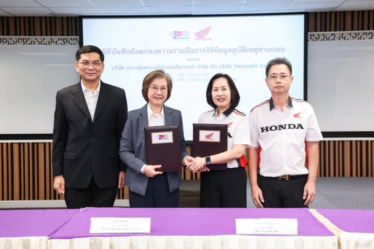 บริษัท ไทยฮอนด้า จำกัด ผู้ผลิตและจัดจำหน่ายรถจักรยานยนต์และเครื่องยนต์อเนกประสงค์ฮอนด้าในประเทศไทย เดินหน้าสานต่อพันธกิจด้านความปลอดภัยทางถนน ด้วยการลงนามบันทึกข้อตกลงความร่วมมือ (MOU) ร่วมกับ บริษัท กลางคุ้มครองผู้ประสบภัยจากรถ จำกัด เพื่อยกระดับการใช้ “ข้อมูลอุบัติเหตุทางถนน” ให้เกิดประโยชน์เชิงลึก ผ่านการนำข้อมูลมาวิเคราะห์หา “สาเหตุหลัก จุดเสี่ยง และพฤติกรรมการเกิดอุบัติเหตุ” อันจะนำไปสู่การพัฒนาแนวทางป้องกันที่ตรงจุด และช่วยลดอัตราการเสียชีวิตจากการใช้รถจักรยานยนต์ในประเทศไทยได้อย่างเป็นรูปธรรม