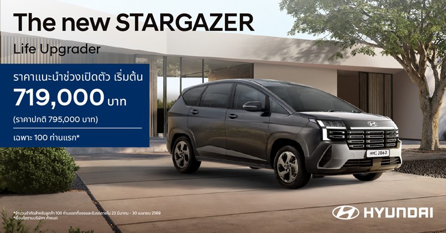 ขณะเดียวกัน ฮุนไดยังเปิดตัว Hyundai new STARGAZER รถยนต์ 6 ที่นั่ง 3 แถว รุ่นปรับโฉมใหม่ รถอเนกประสงค์ที่ออปชันความปลอดภัยครบสุดในคลาสด้วย Hyundai SmartSense มากถึง 13 ระบบ พัฒนาภายใต้แนวคิด “Life Upgrader” อัปชีวิตให้เหนือกว่า เพื่อตอบโจทย์ไลฟ์สไตล์ของผู้ใช้งานยุคใหม่ ทั้งครอบครัวรุ่นใหม่ สตาร์ตอัปยุคใหม่ และผู้ที่ต้องการรถยนต์ที่รองรับการใช้งานได้หลากหลายในคันเดียว ตัวรถได้รับการออกแบบใหม่ทั้งหมด ให้ภาพลักษณ์แข็งแกร่ง ทันสมัย และมีบุคลิกแบบ SUV มากยิ่งขึ้น โดยตัวถังมีความยาวเพิ่มขึ้น 115 มิลลิเมตร ช่วยให้สัดส่วนโดยรวมดูใหญ่และทรงพลังขึ้น พร้อมไฟหน้า ไฟท้าย แบบ LED และไฟ Daytime Running แบบ Integrated ที่ช่วยเพิ่มความโดดเด่นบนท้องถนน